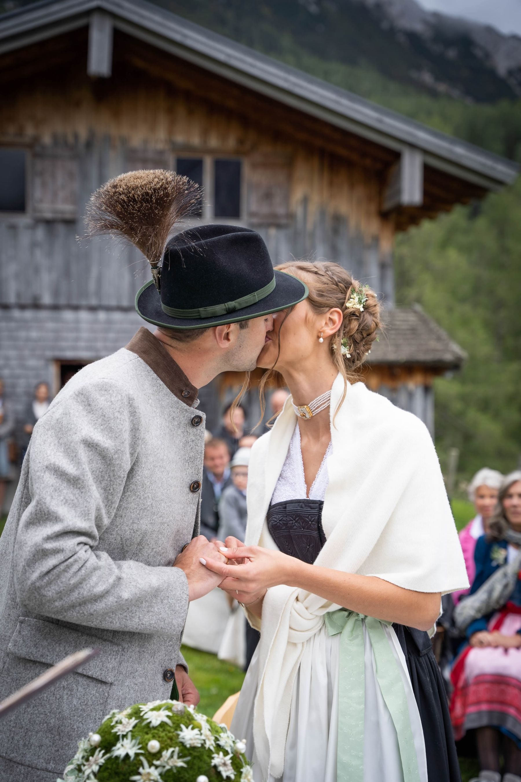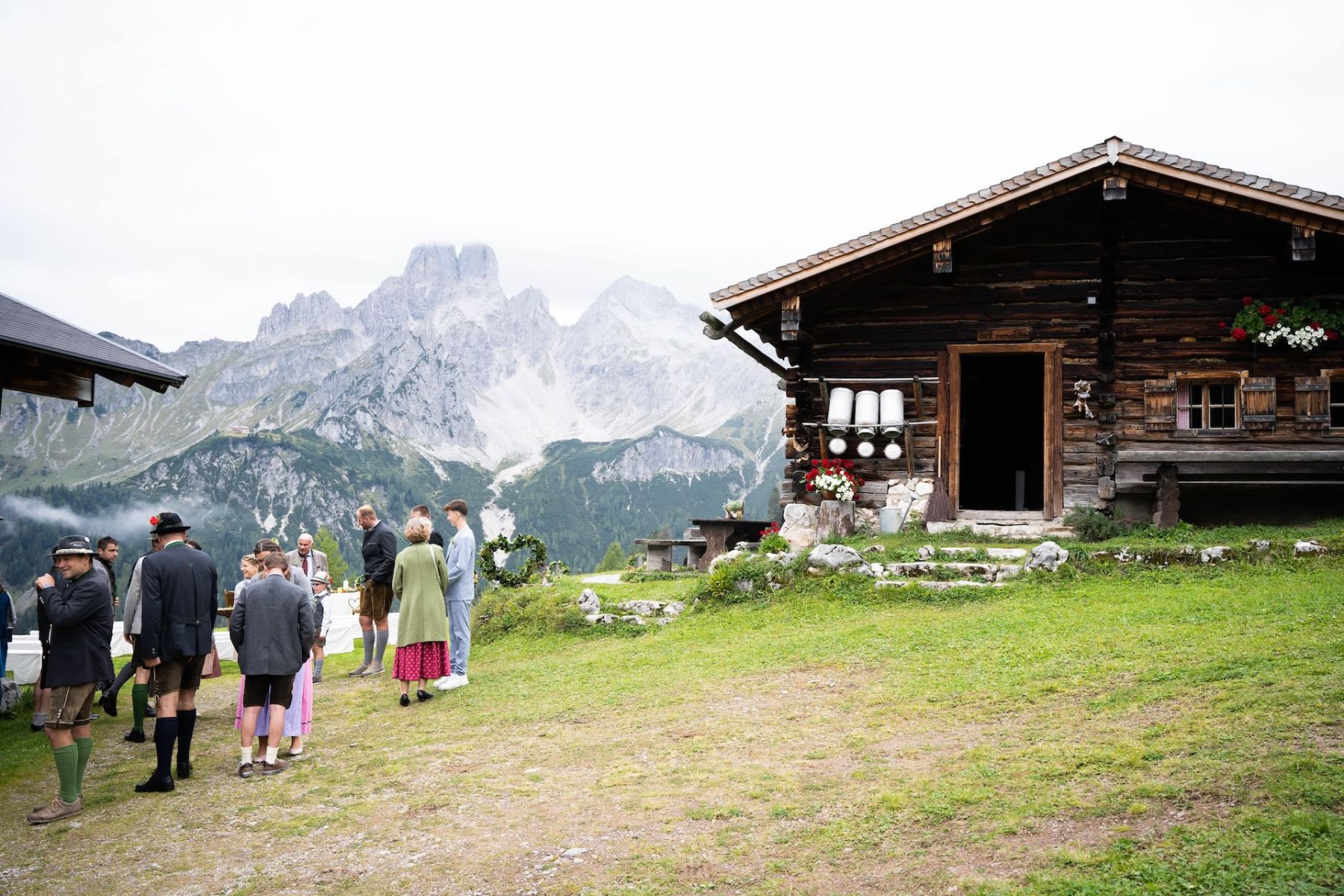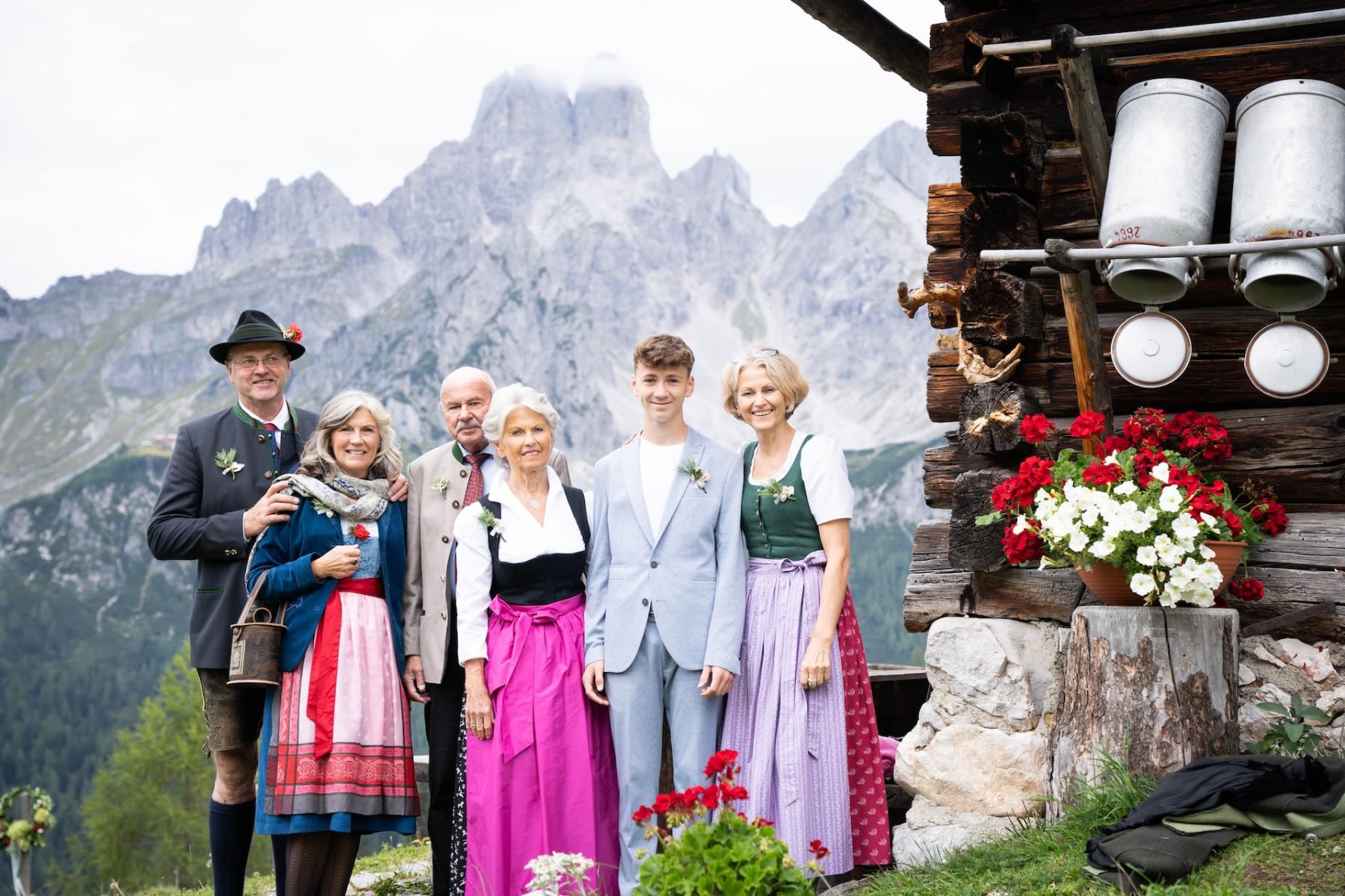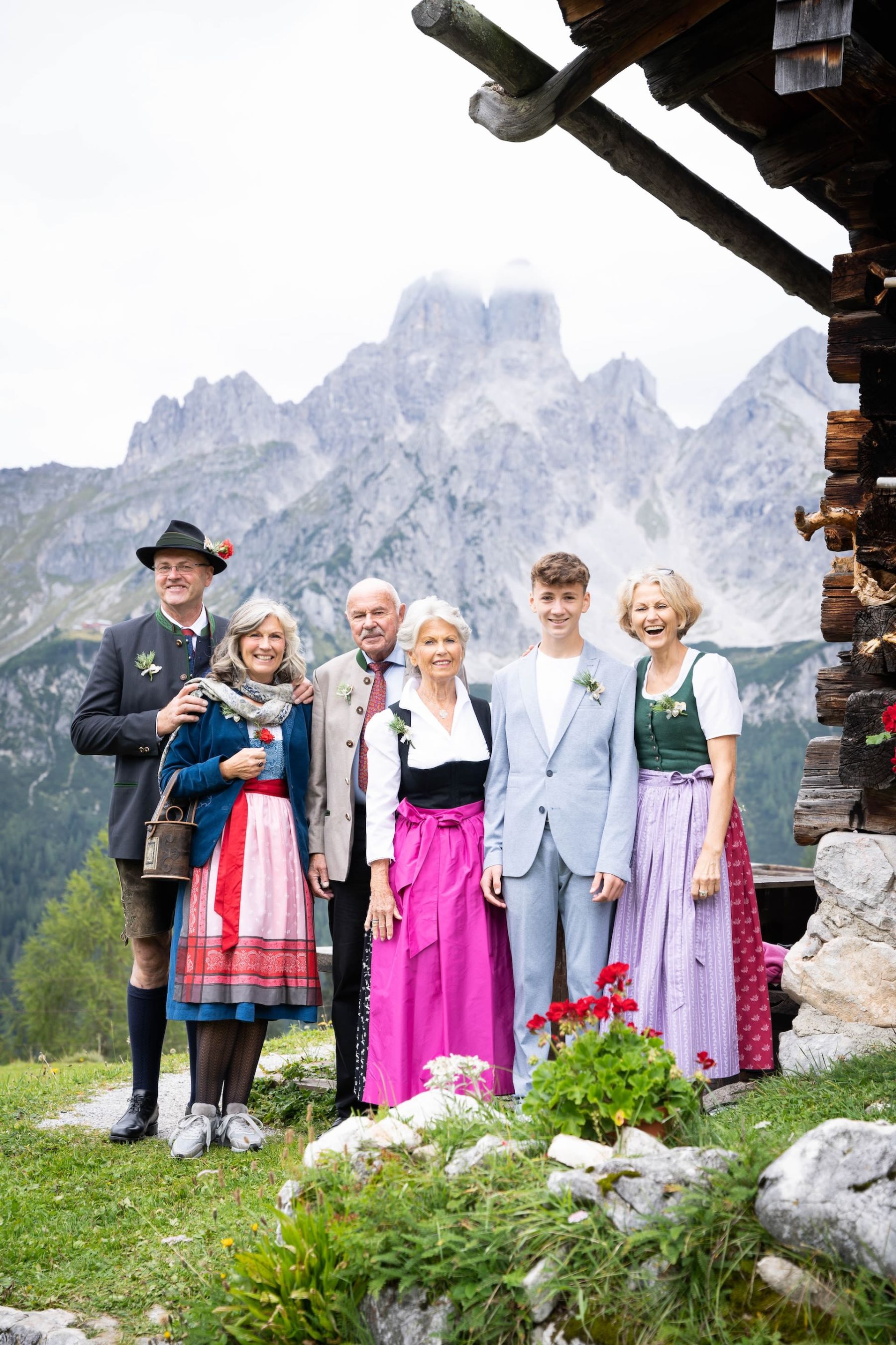 Das Shooting auf unserer Alm spiegelte die tiefe Verbundenheit zur Heimat und den liebevollen Charme einer klassischen Hochzeit wider. In festlicher Tracht – Mieder und Lederhose – strahlte das Brautpaar mit der prachtvollen Hochzeitsgesellschaft um die Wette. Die imposante Bergkulisse und das urige Ambiente der Löckenwaldhütte verliehen dem Tag eine einzigartige Atmosphäre voller Geborgenheit, Freude und authentischer Alpenromantik.