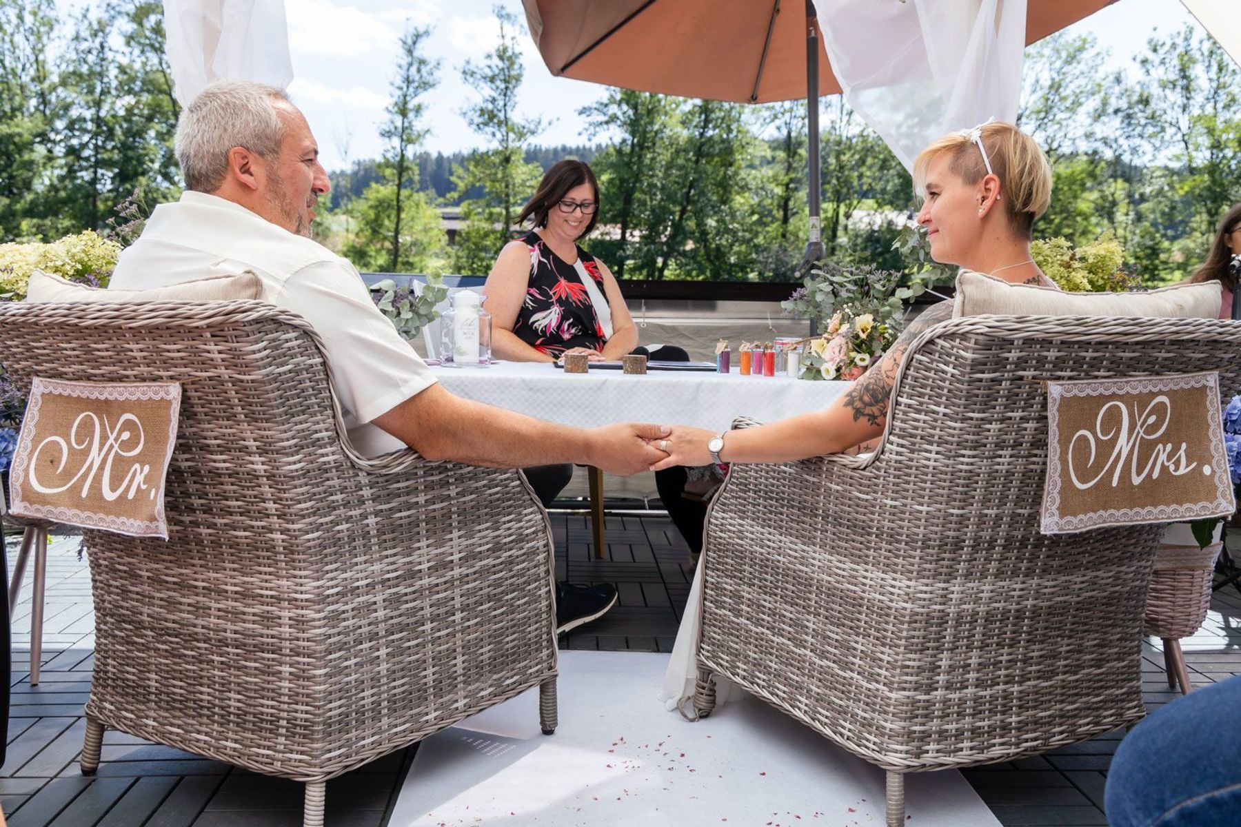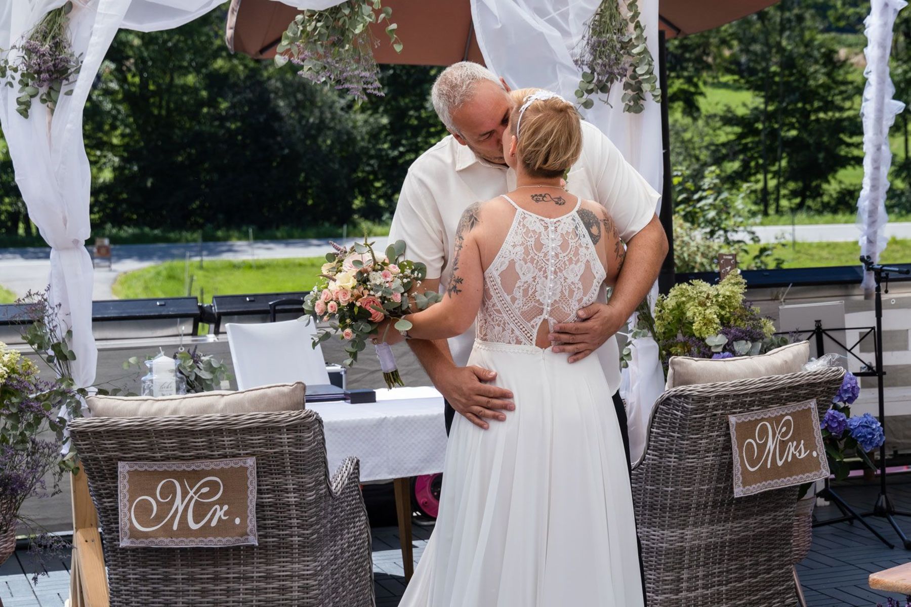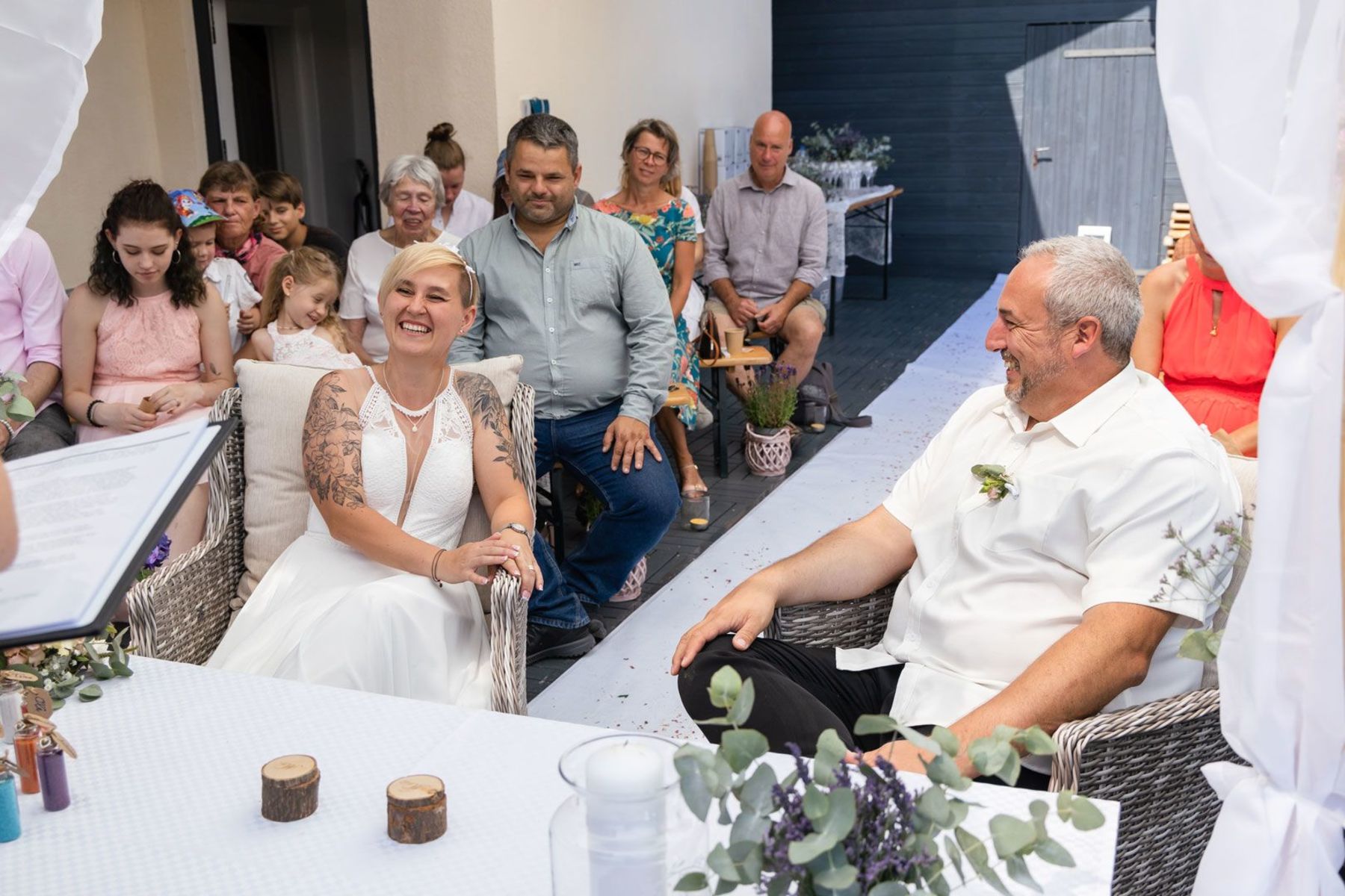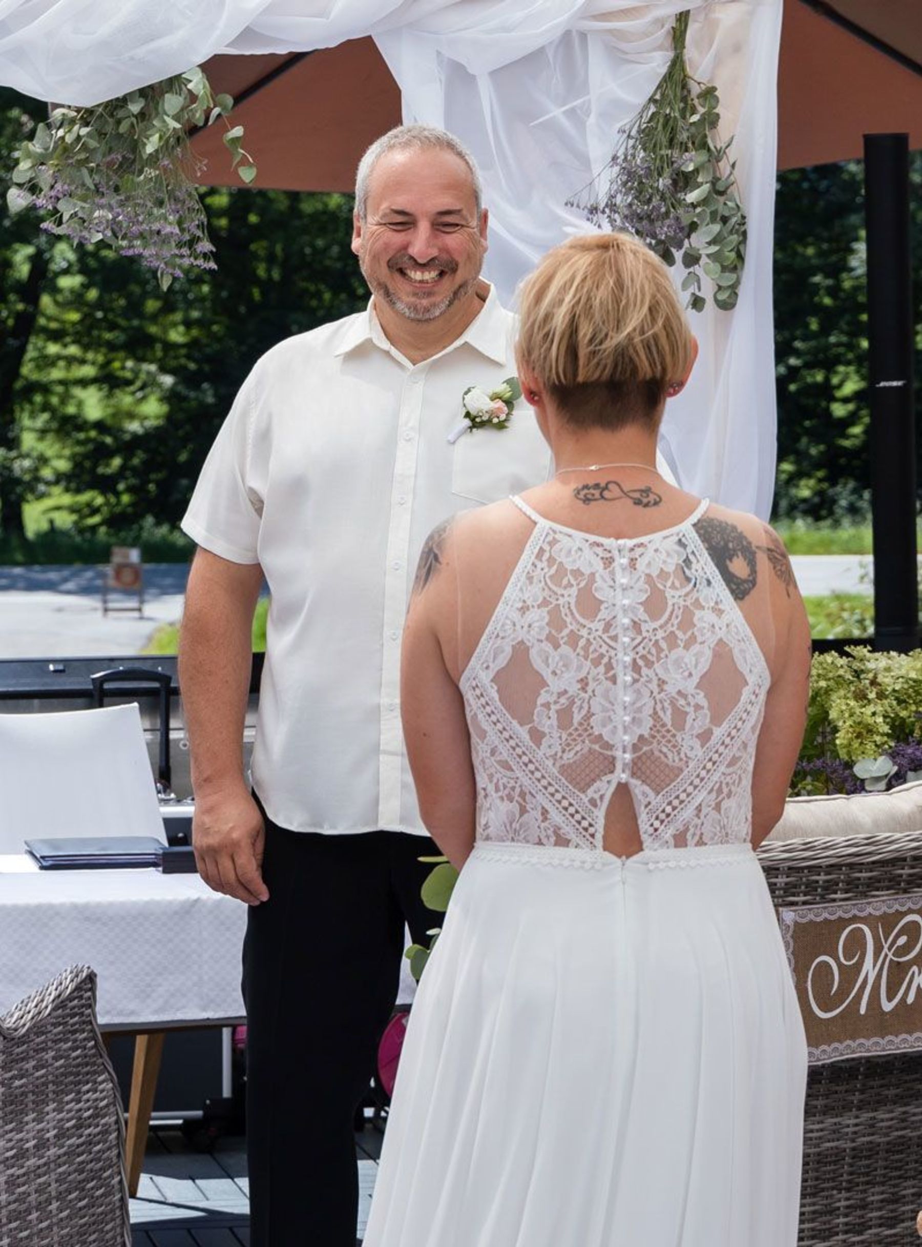 Tina und Oliver feierten ihre freie Trauung in einer ganz besonderen Umgebung – dem eigenen Garten. Die entspannte Gartenhochzeit spiegelte perfekt ihre naturverbundene und lebensfrohe Art wider. Zwischen Vogelgezwitscher und liebevoller DIY-Deko gaben sie sich das Ja-Wort, umgeben von Familie und Freunden.