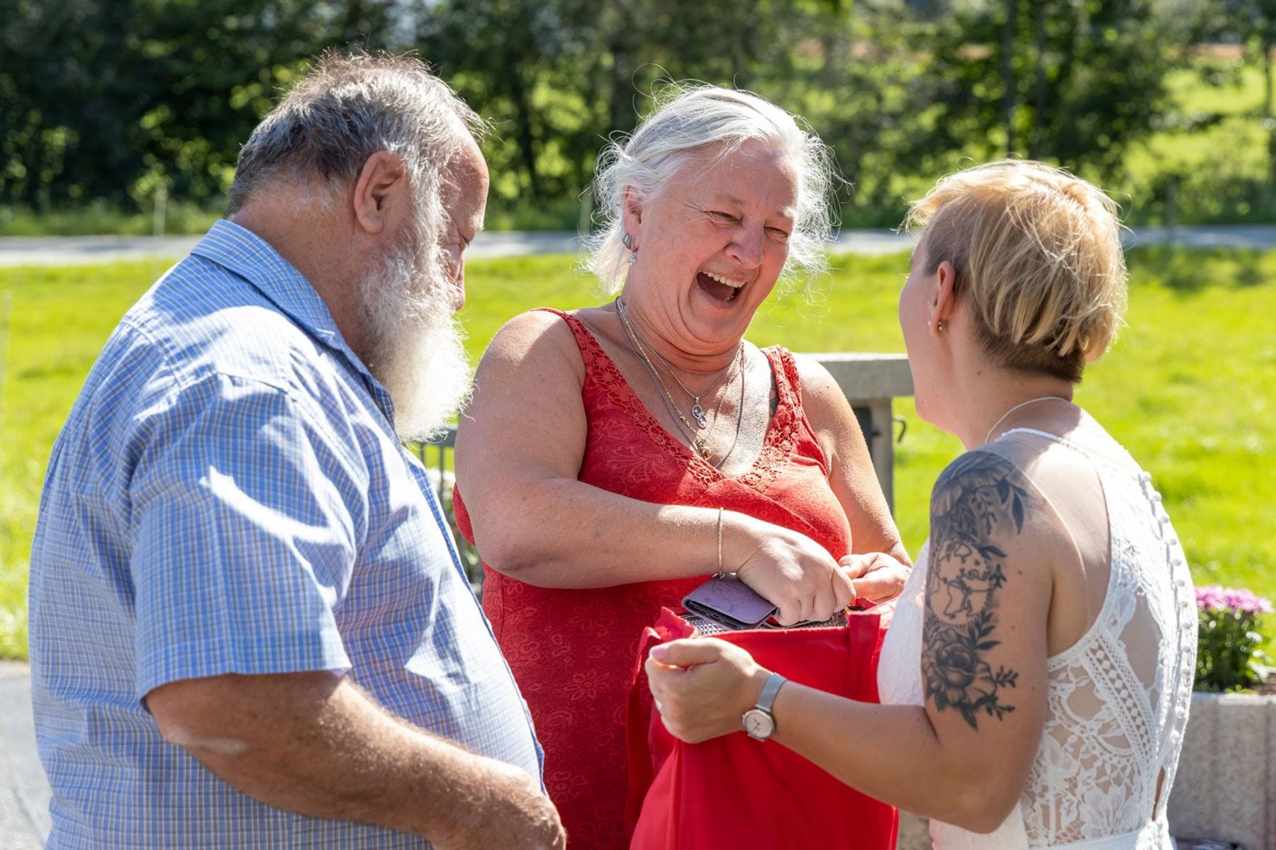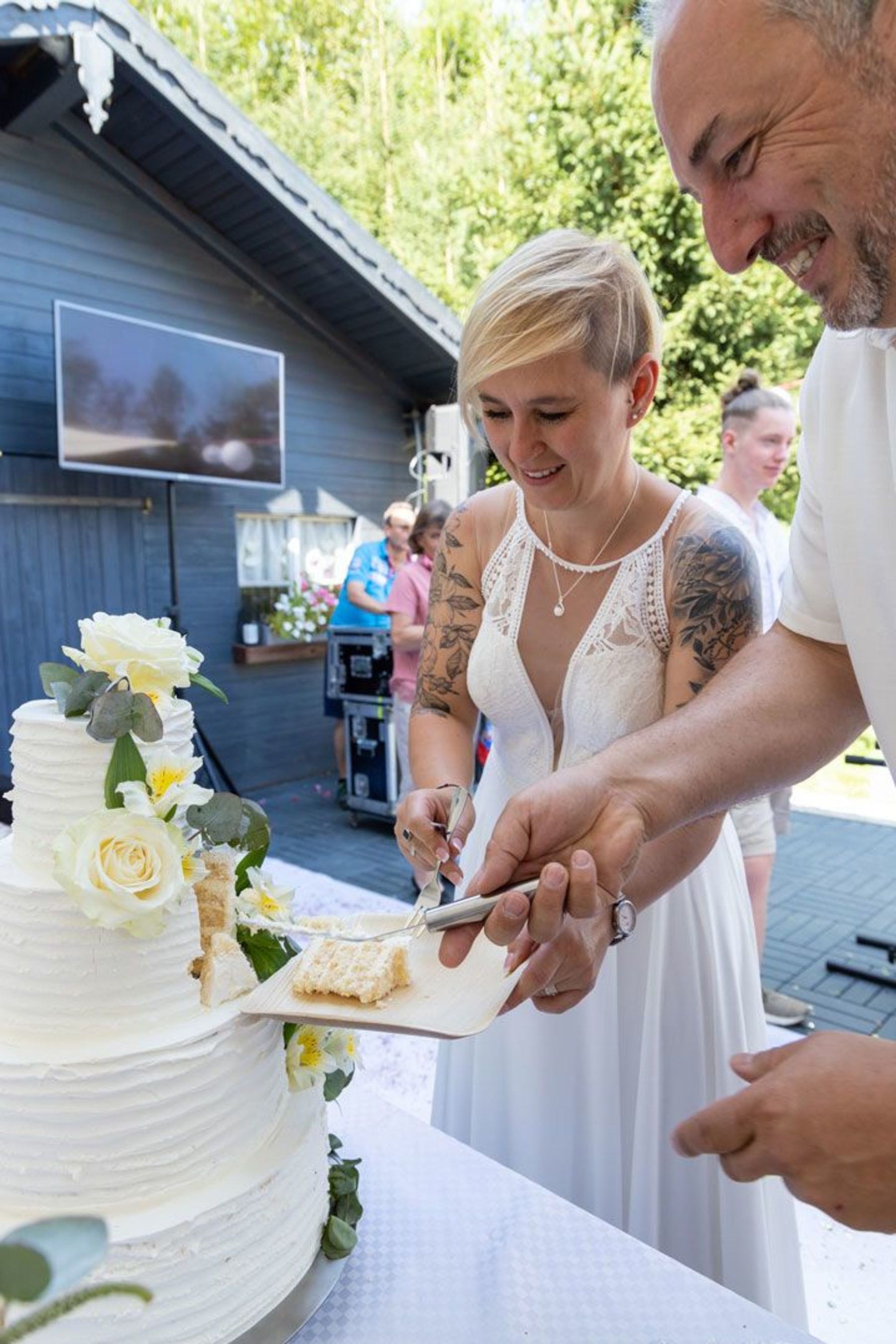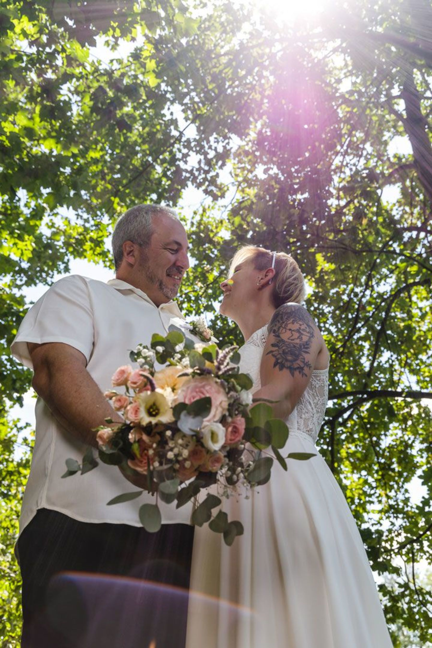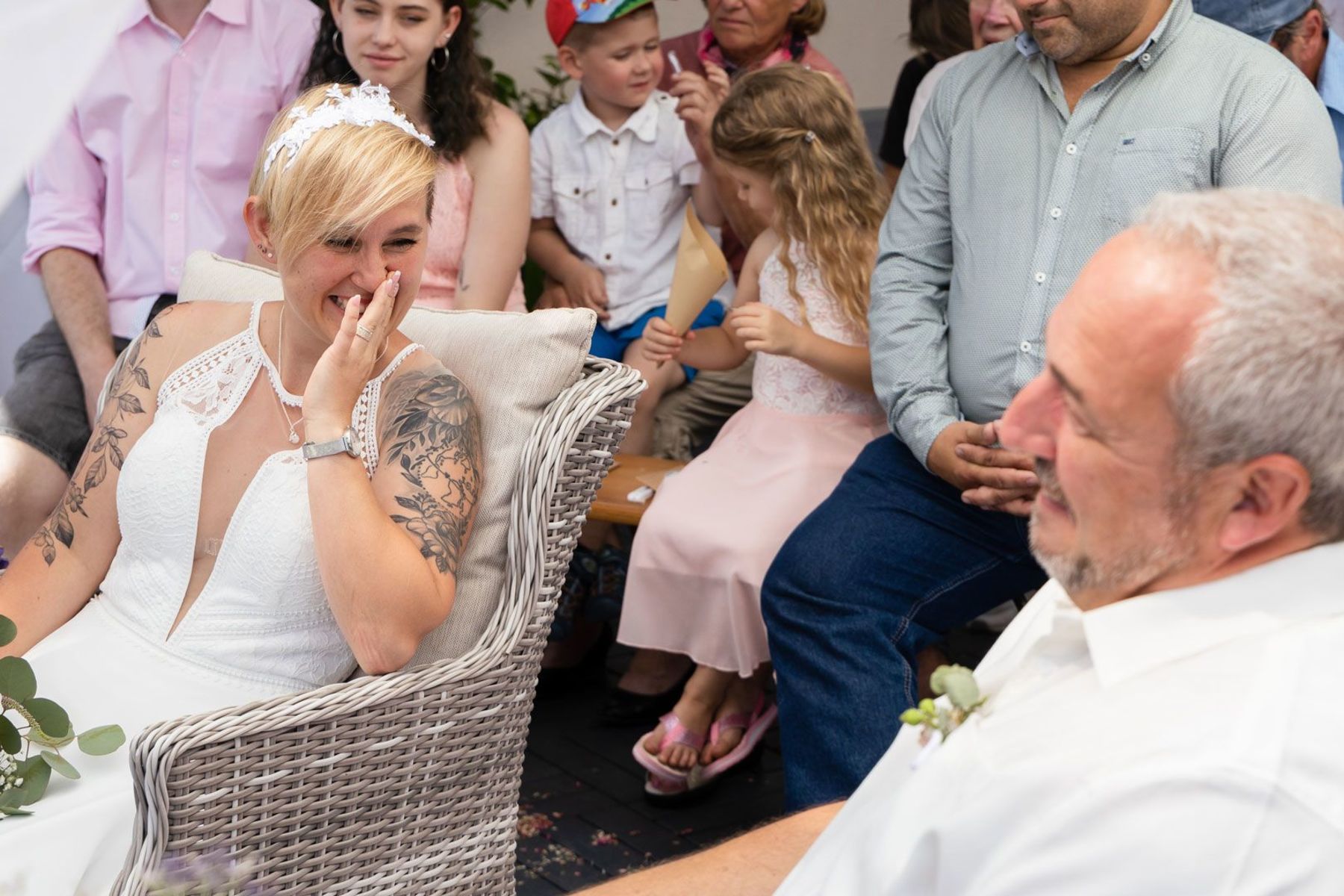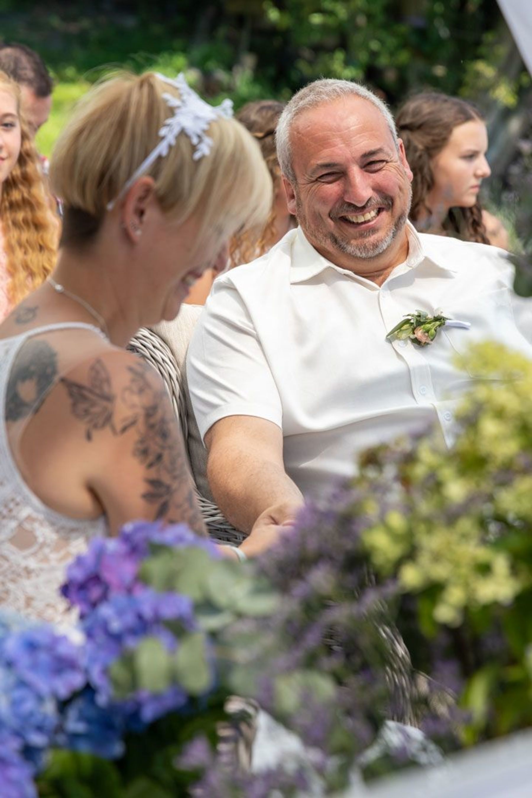 Tina und Oliver feierten ihre freie Trauung in einer ganz besonderen Umgebung – dem eigenen Garten. Die entspannte Gartenhochzeit spiegelte perfekt ihre naturverbundene und lebensfrohe Art wider. Zwischen Vogelgezwitscher und liebevoller DIY-Deko gaben sie sich das Ja-Wort, umgeben von Familie und Freunden.