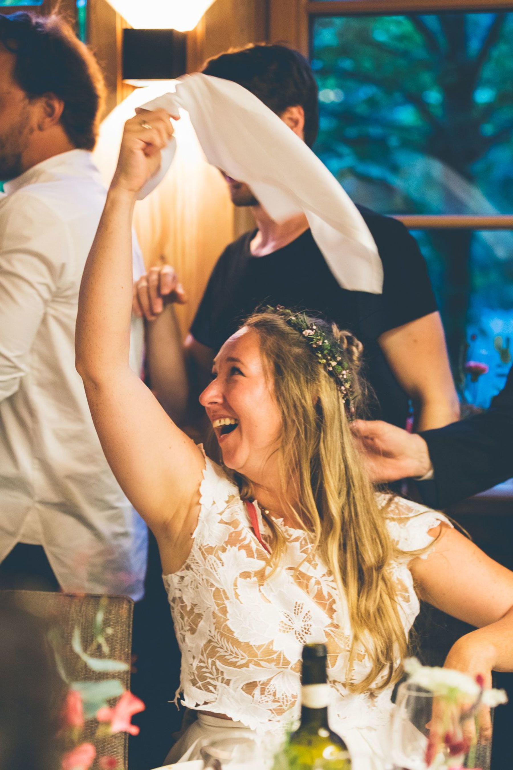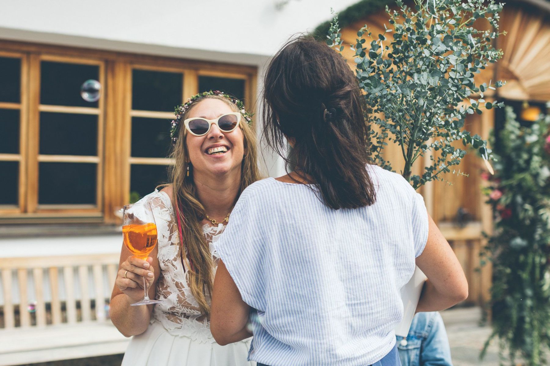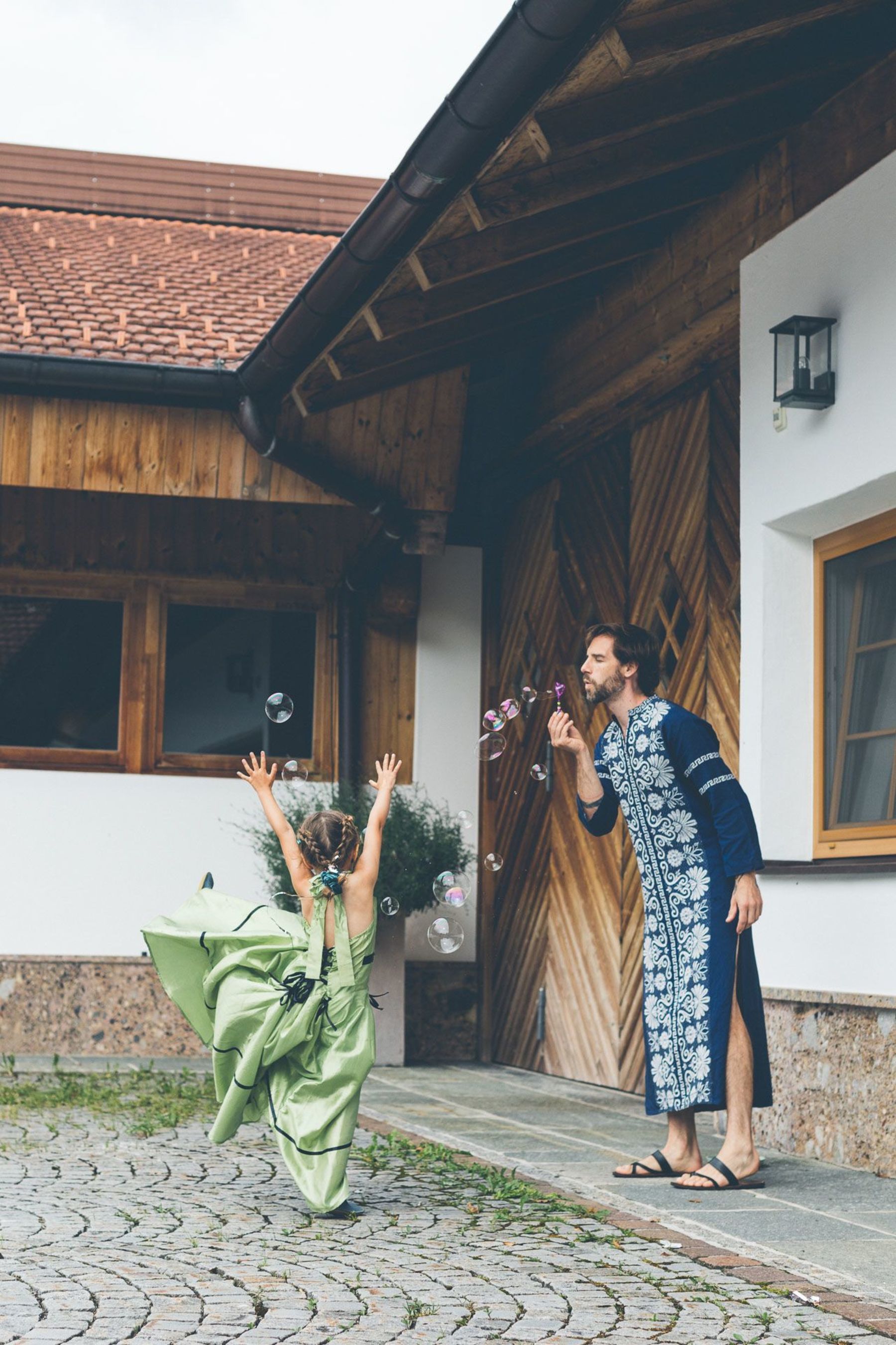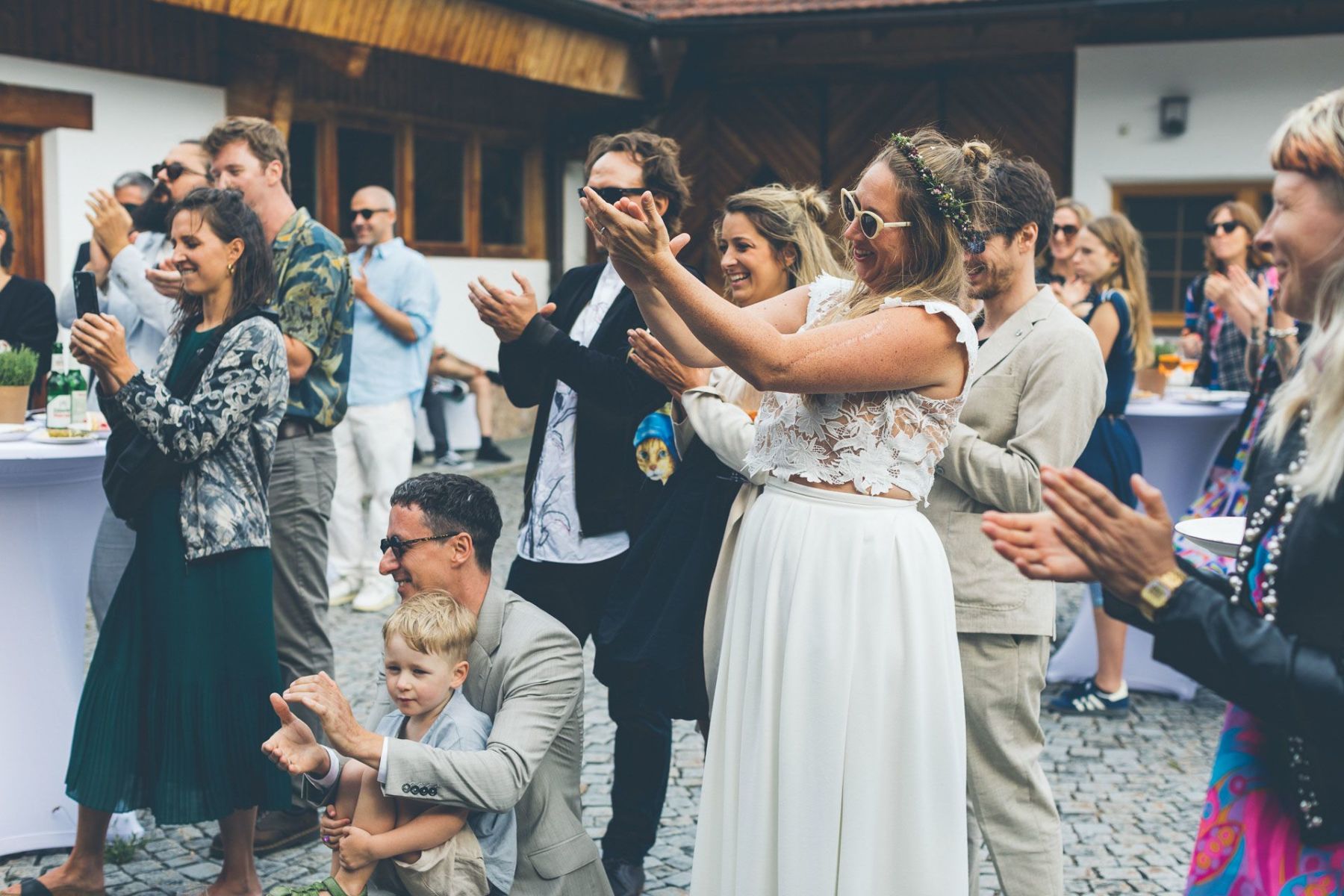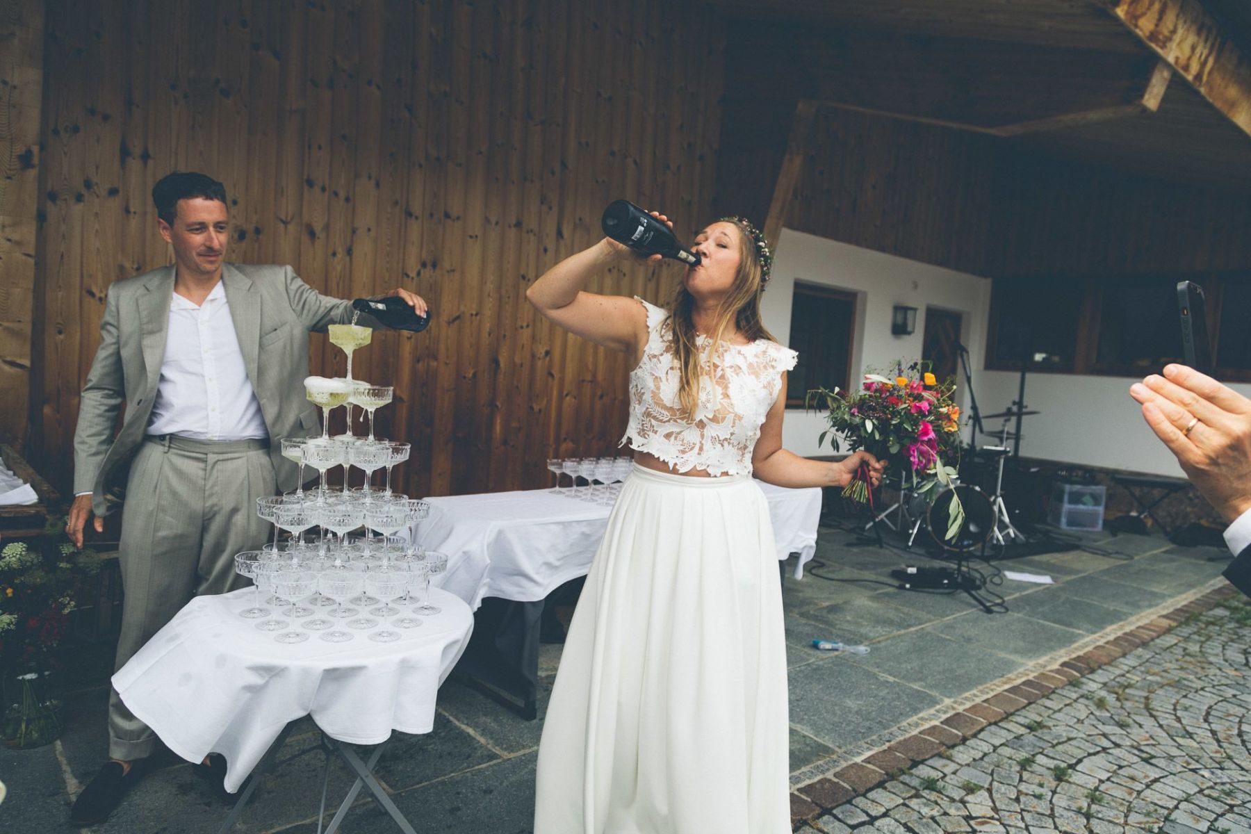 Gefeiert wurde in einem rustikalen Hof, der sich in ein Märchen aus Lichtern und Musik verwandelte. In der Mitte: ein schillernder Champagnerturm, umringt von Kindern, die kichernd durch die Reihen flitzten, während die Erwachsenen ihre Gläser hoben.