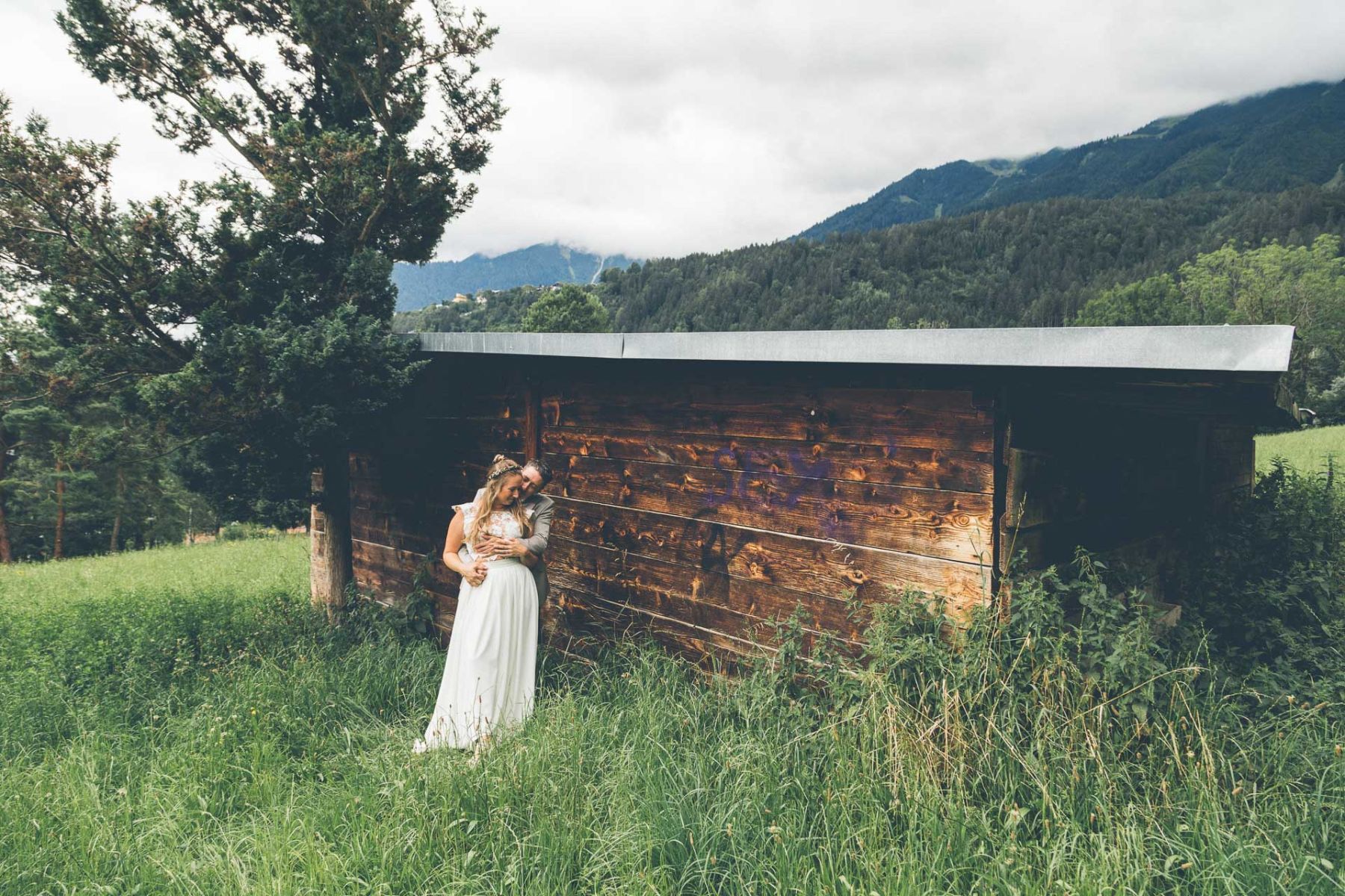 In den Bergen Tirols, hoch über Innsbruck, begann eine Hochzeit, die alles andere als gewöhnlich war. Das Paar hatte seine Fotos nicht in einem schicken Schlossgarten gemacht, sondern dort, wo ihre gemeinsame Geschichte begann: bei einer alten Hütte, übersät mit bunten Graffitis, mit Blick auf die Berge Innsbrucks, die sie einst zusammenbrachten.