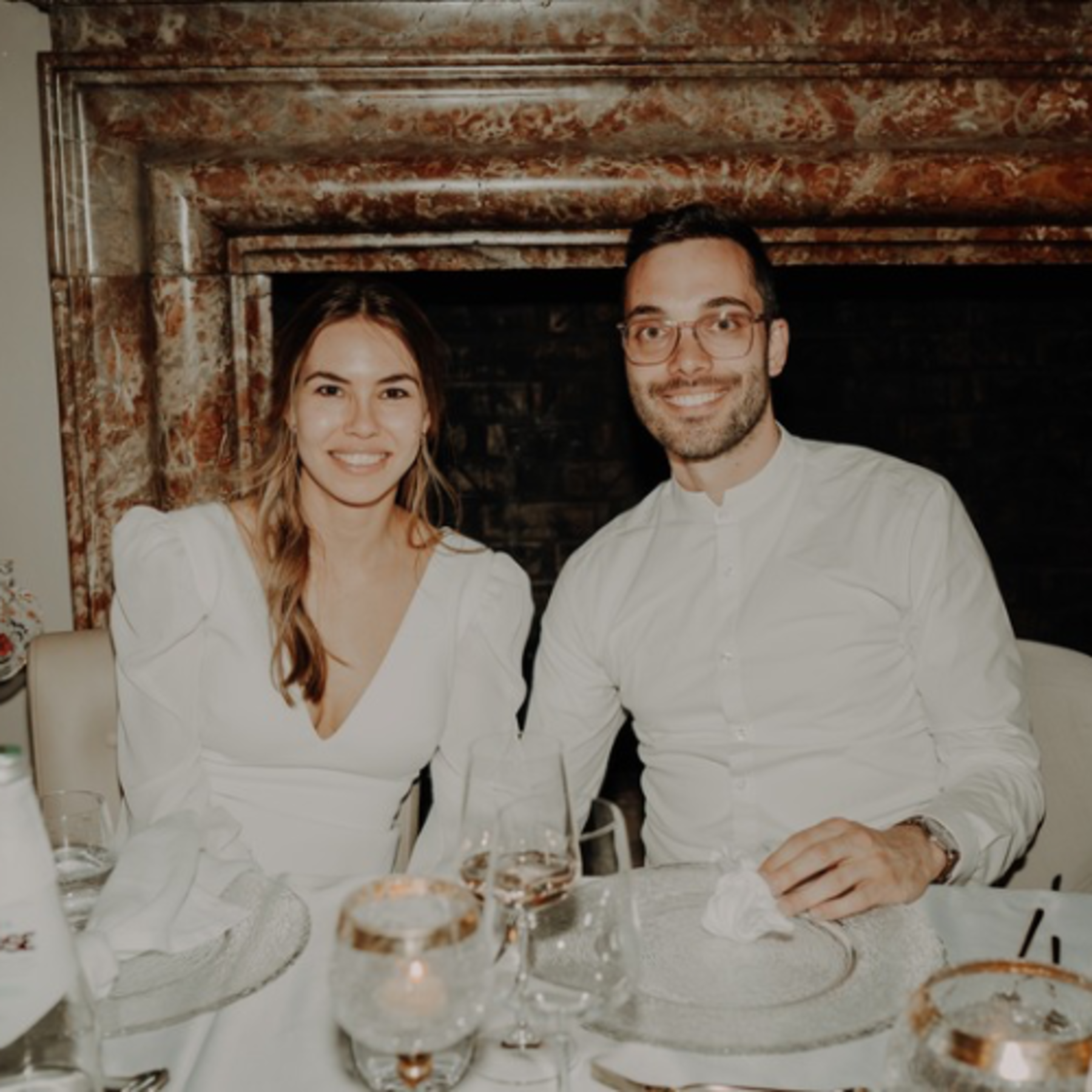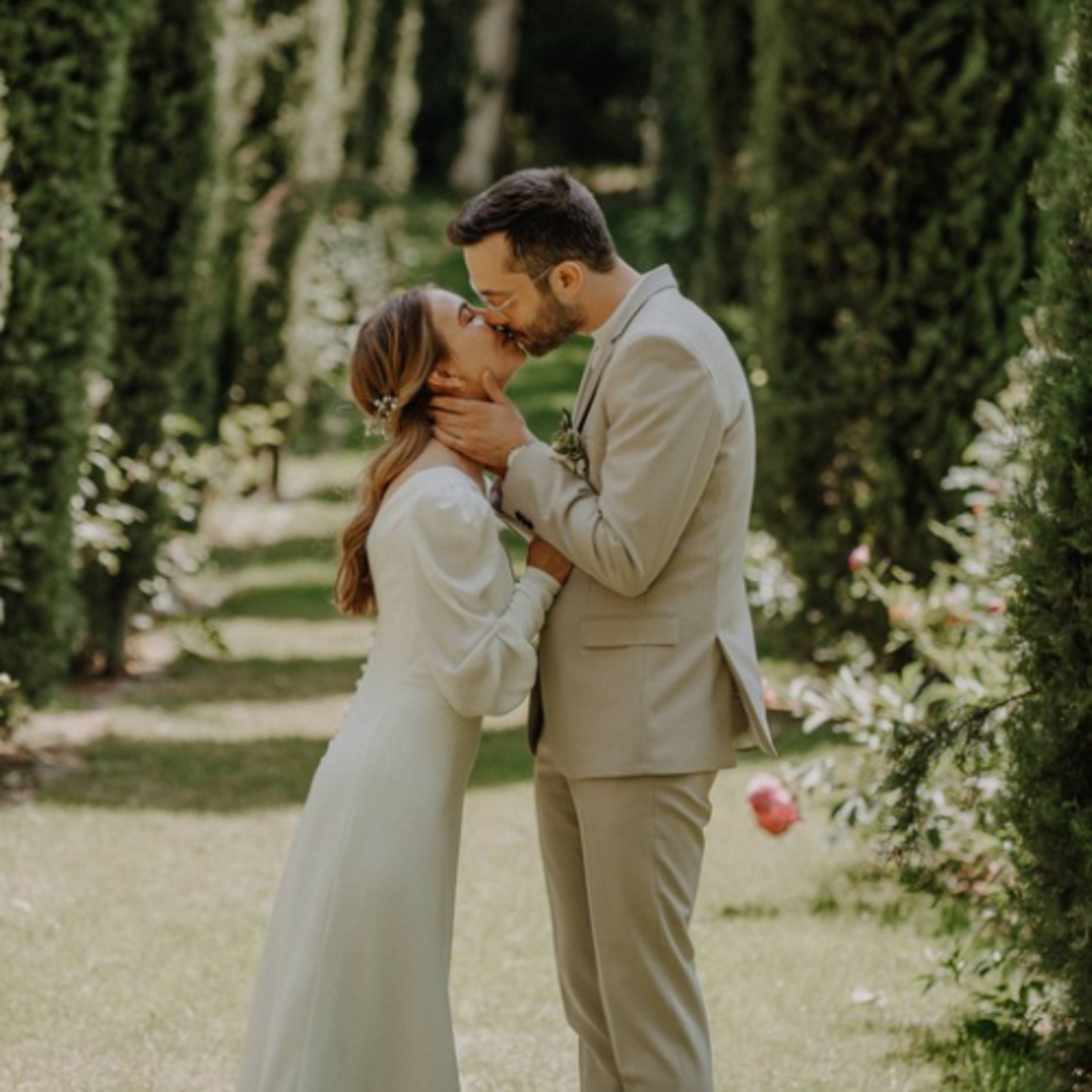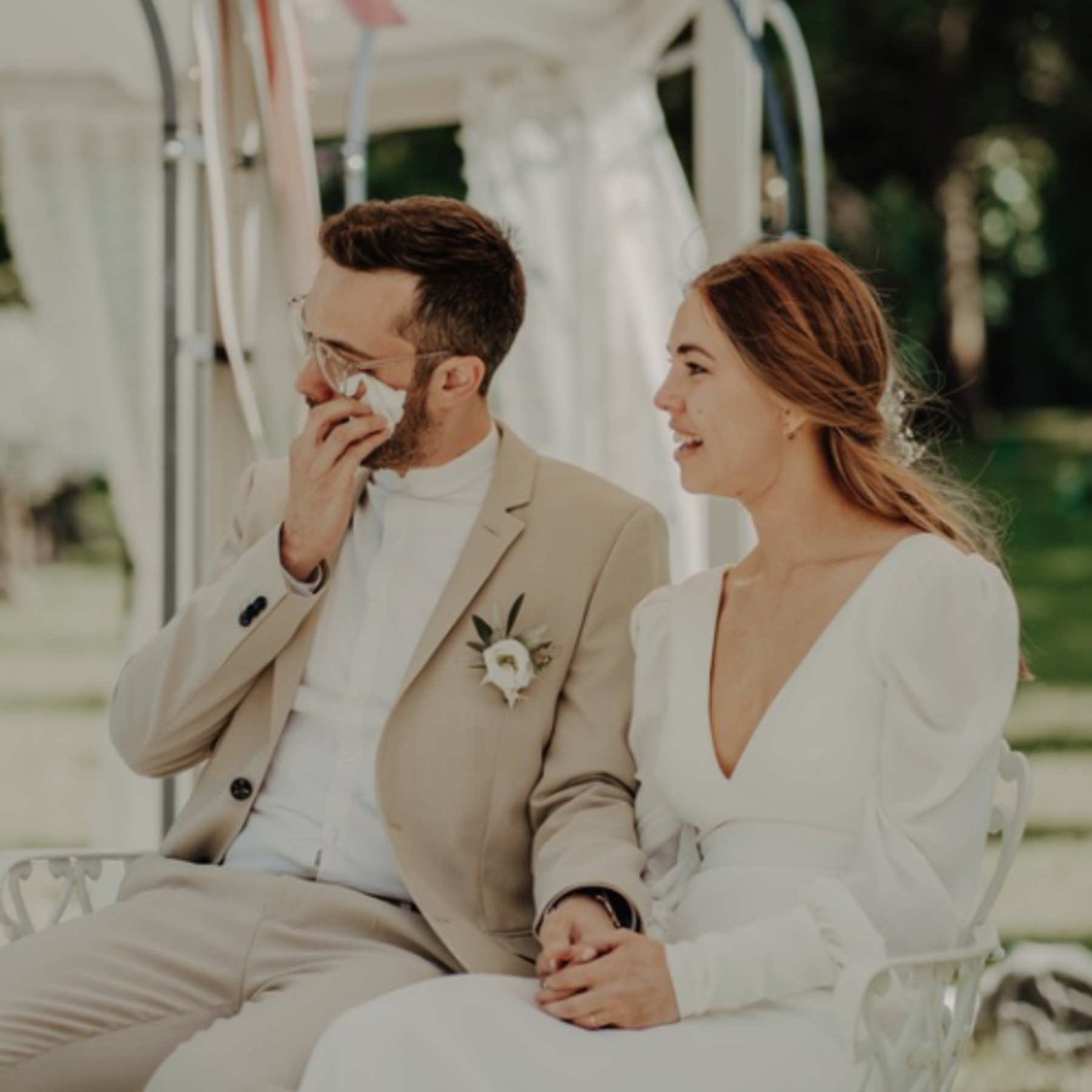 Die Braut trug ein fließendes, leichtes Kleid mit feinen Details und trug ihr Haar locker hochgesteckt – geschmückt mit etwas getrocknetem Schleierkraut. Ihr Brautstrauß bestand aus weißen Rosen – klassisch, schlicht und sehr elegant. Der Bräutigam wählte einen hellen Leinenanzug mit offener Knopfleiste, was dem Look eine moderne und gleichzeitig entspannte Note verlieh.