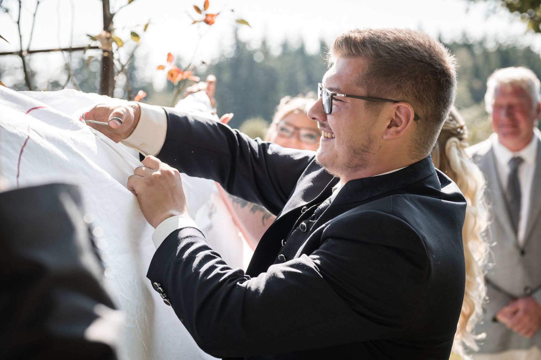 Nach der emotionalen Zeremonie folgten Hochzeitsspiele wie das Durchsteigen eines Bettlakenherzens und Baumstammsägen – Symbole für den gemeinsamen Start in die Ehe.