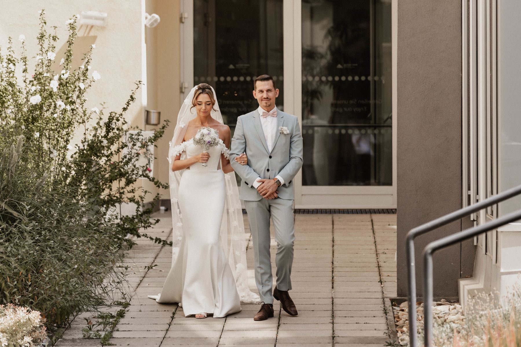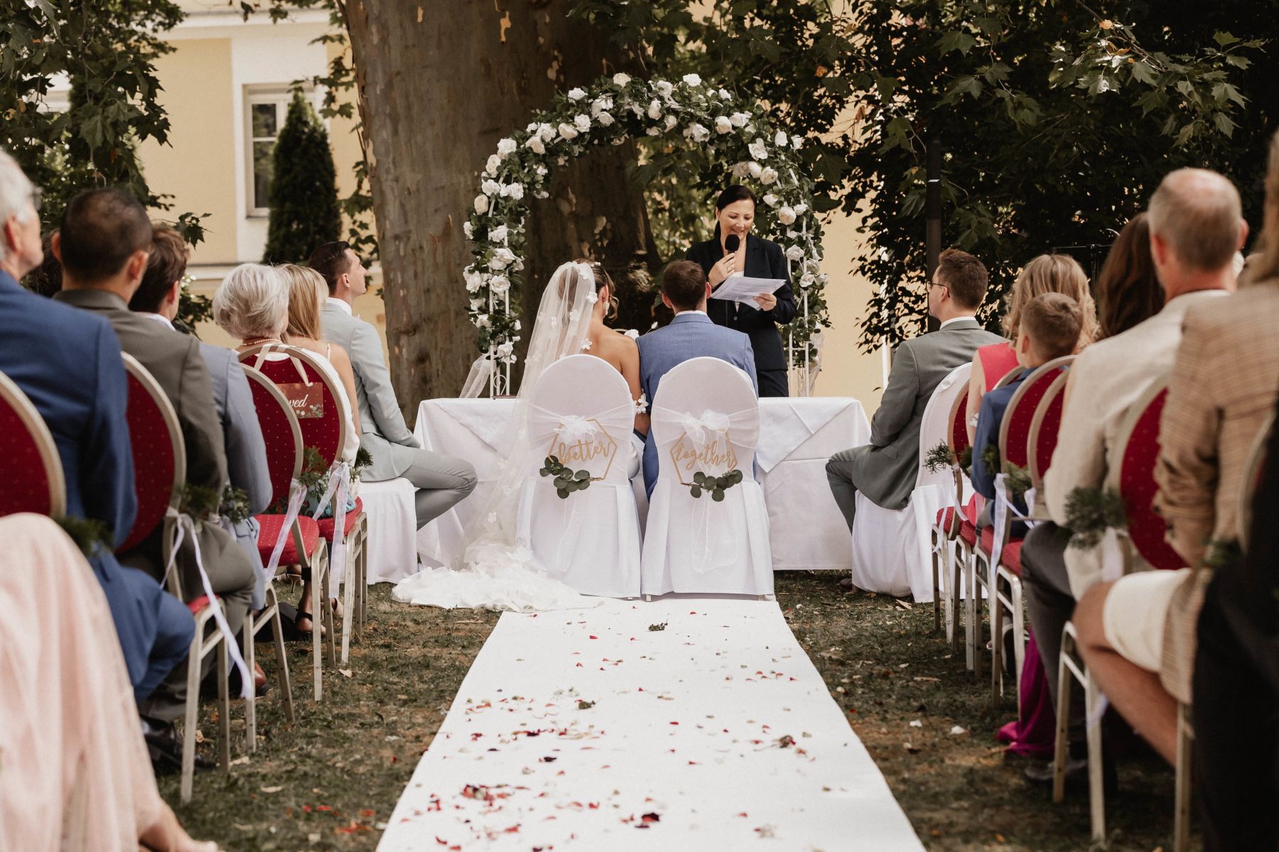 Als Melanie in den wunderschönen Hotelgarten eintrat, der in das warme Licht des Tages getaucht war, hielt jeder den Atem an. Ein sanfter Windzug durch die Bäume machte den Moment noch magischer – als ob all jene, die nicht mehr unter uns sind, in den Herzen mit dabei waren.
