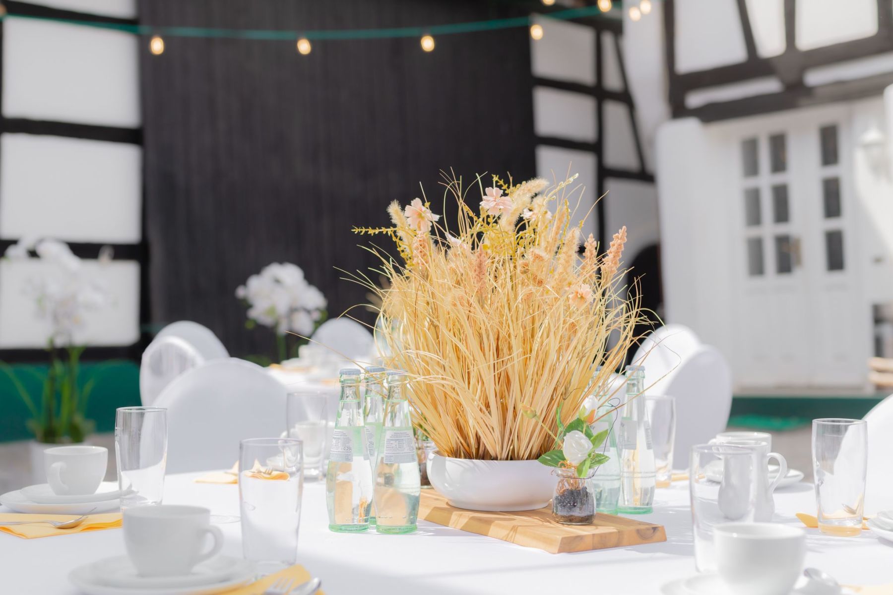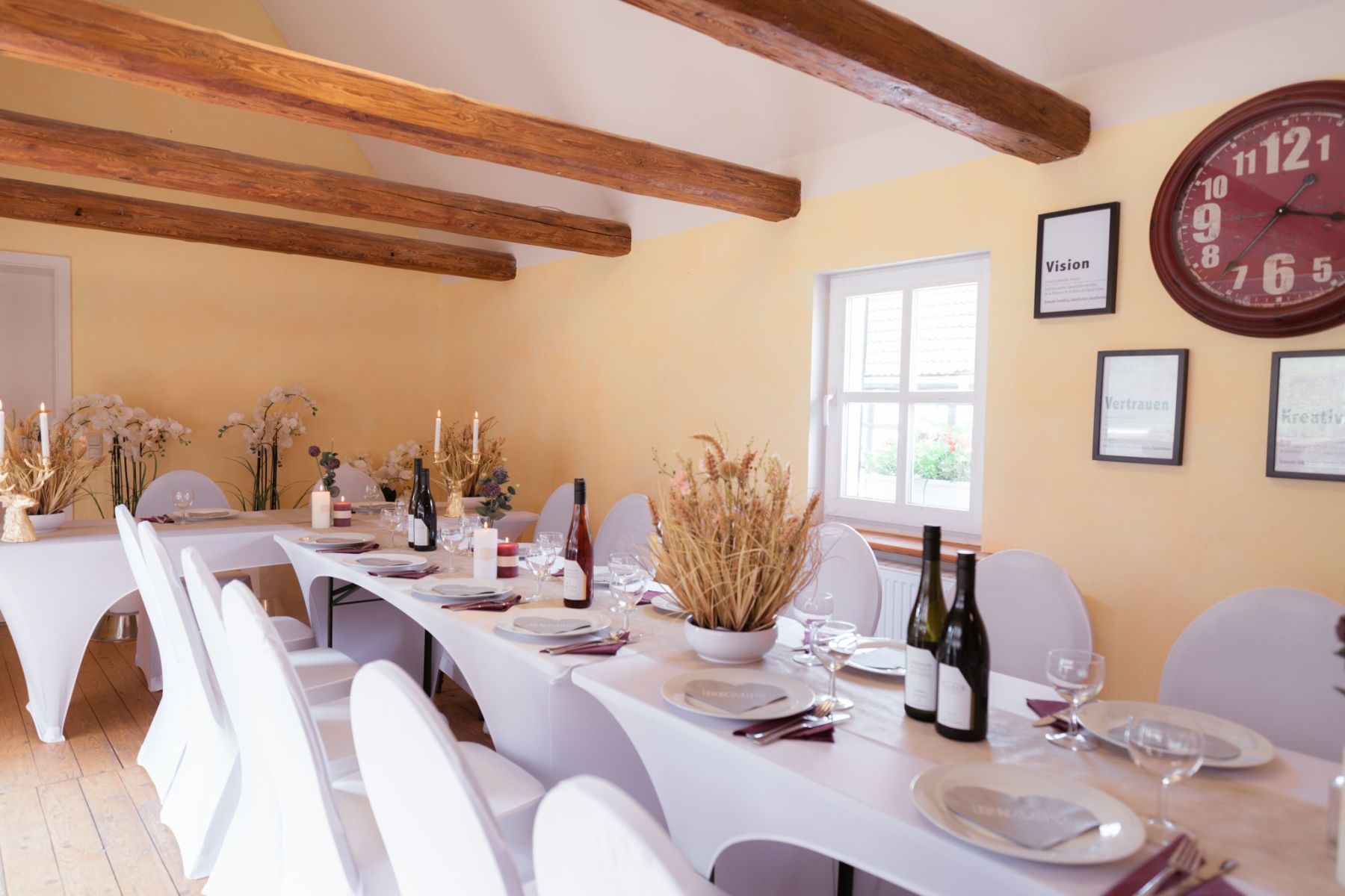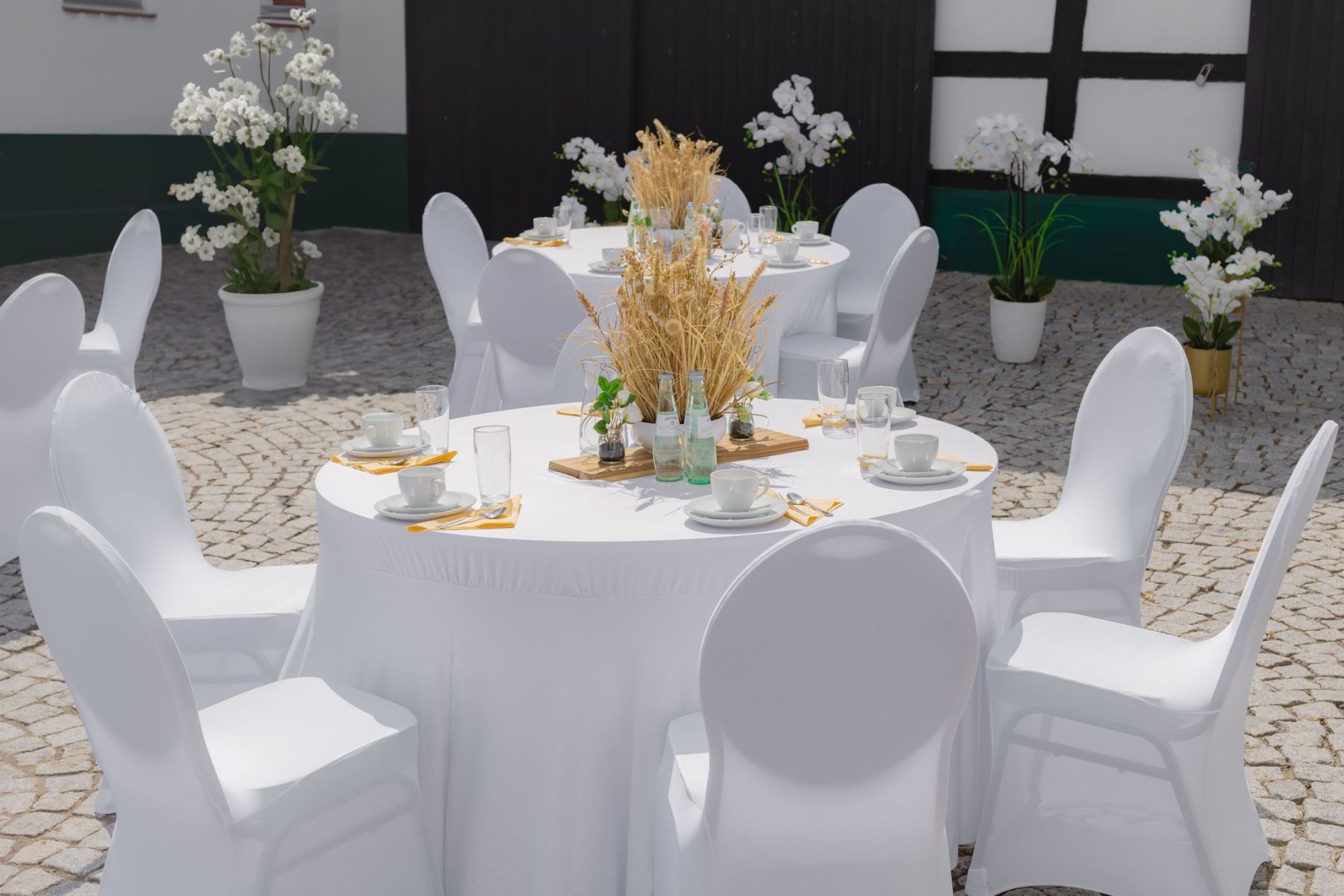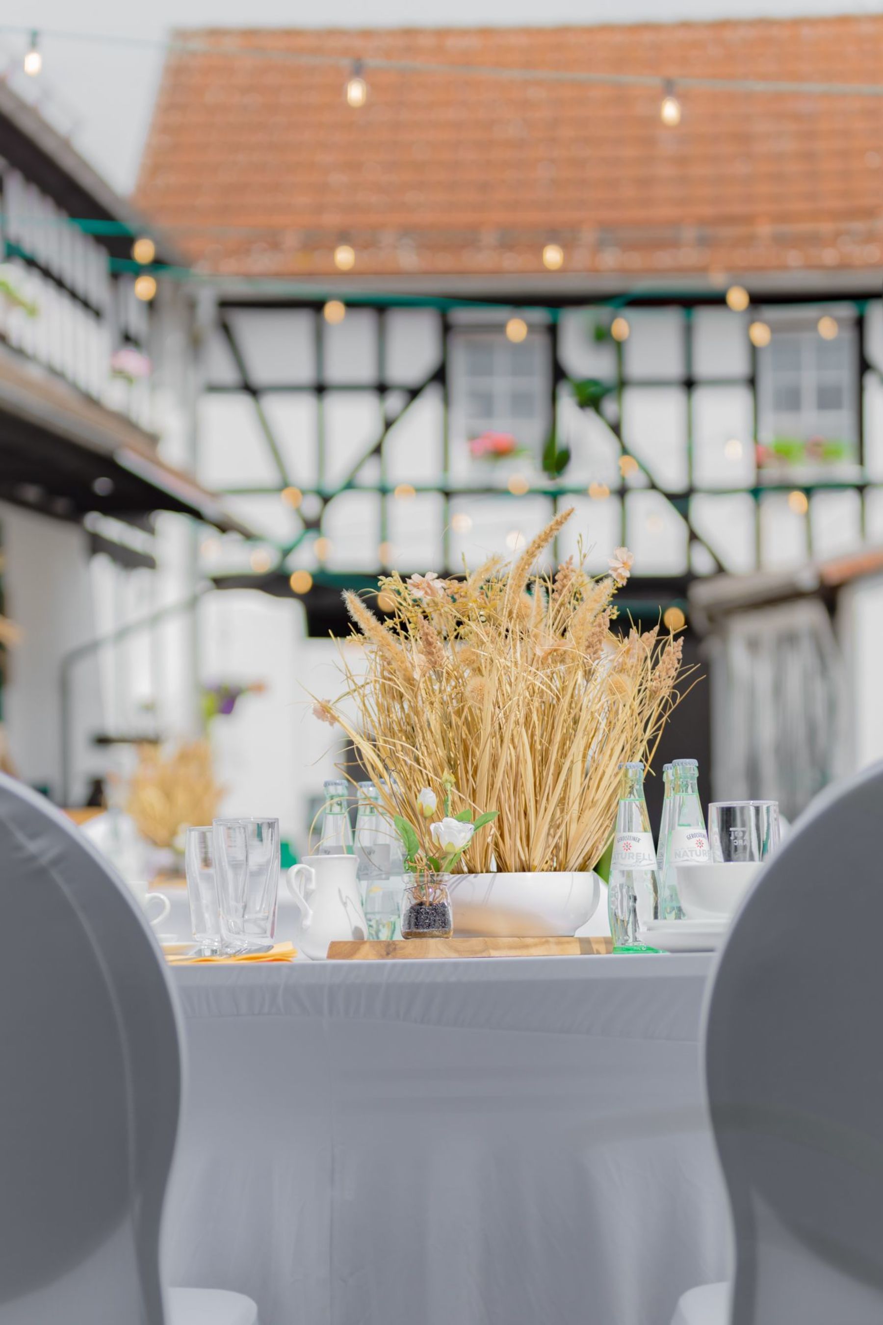 Wir haben für euch eine Musterhochzeit liebevoll inszeniert und fotografiert, damit ihr einen ersten Eindruck bekommt, wie eure Feier bei uns aussehen könnte. Hier seht ihr ein Outdoor Beispiel, unseren Hof und den Eventraum. Danke an das Brautpaar, was dazugekommen ist.
