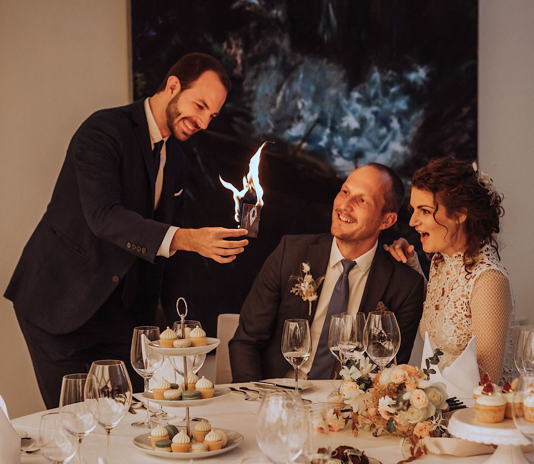 Ben war einmalig!! Wir hatten niemanden unserer Gäste von ihm erzählt und man hat die Verwunderung in allen Augen sehen können als er sich durch die Leute gemischt hat und seine Tricks an den Tischen präsentierte. Er hat sich auch speziell für uns als Brautpaar nochmal extra Zeit genommen und uns mit seinen Tricks aber auch seiner Art verzaubert. Die Stimmung während der Agape war sehr aufgeweckt und es war einfach nur toll ihn auf unserer Hochzeit gehabt zu haben. Empfehle ich jedem weiter! Danke nochmal lieber Ben!