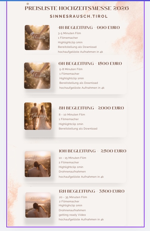 Ihr feiert. Ich erzähle eure Geschichte. Authentisch, laut, emotional und charmant. Hochzeitsfilme mit Charakter – modern produziert und voller echter Erinnerungen.
