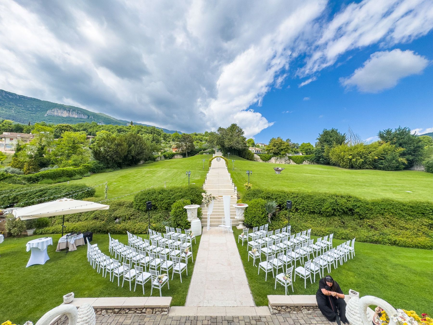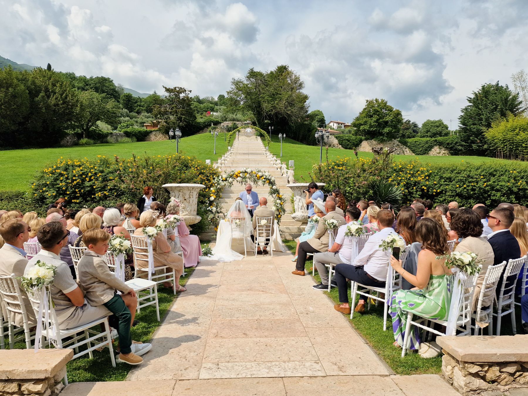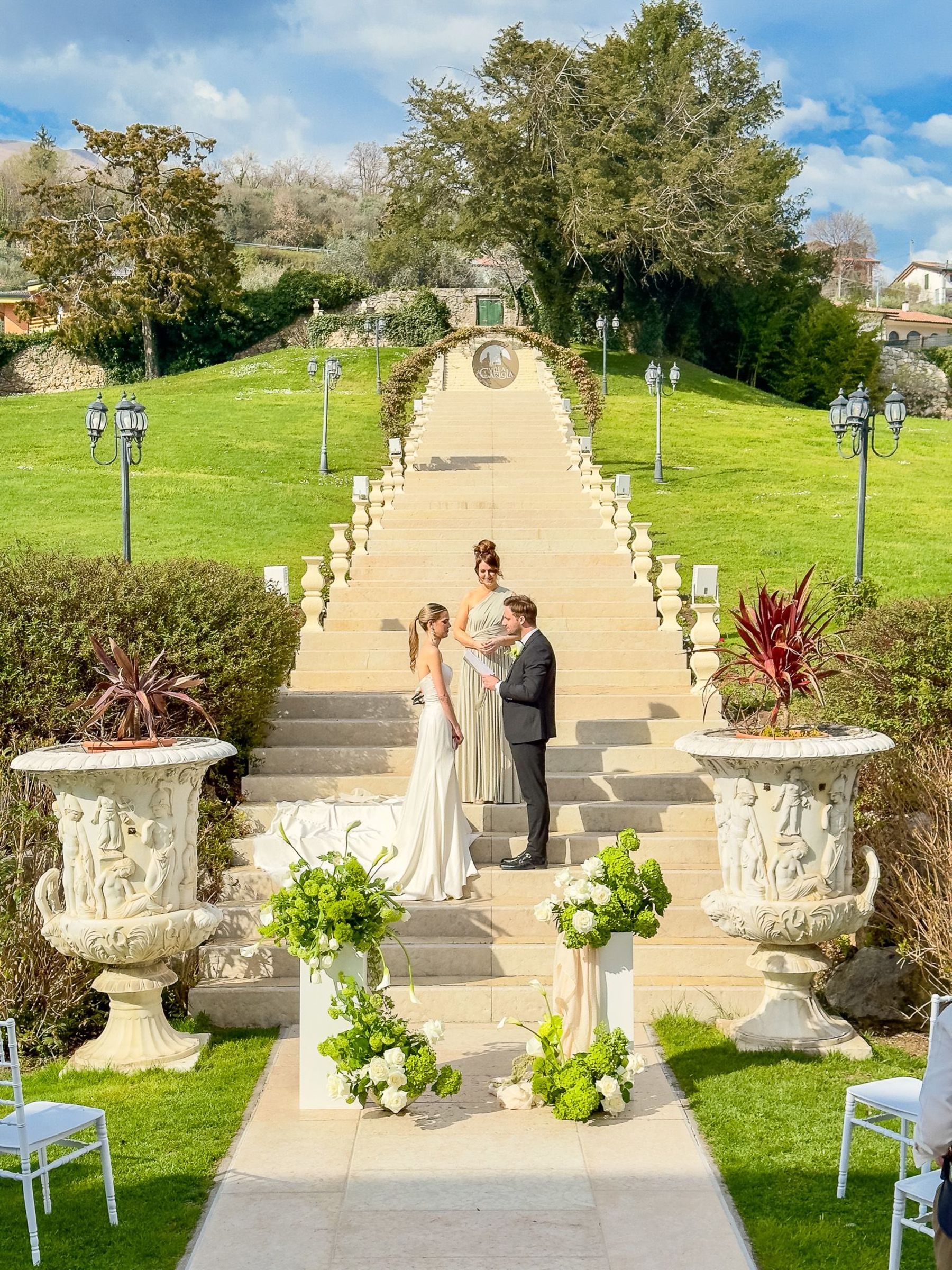 Große Terrassen mit eindrucksvoller Aussicht, mit Fresken geschmückte Räume, helle Salons mit großen Fenstern, üppige grüne Rasenflächen … Die Villa Cariola bietet den idealen Rahmen für jeden Moment Ihrer Hochzeit: vom reichhaltigen Buffet, mit dem der Empfang eröffnet wird, über das unvergessli